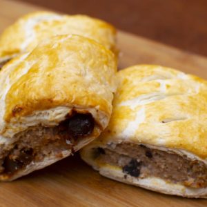 Three freshly made gourmet sausage rolls; tender British smoky BBQ pork & smoked bacon, wrapped in golden puff pastry. Will keep up to 3 days in the fridge, or suitable for home freezing for up to one month (allow 12 hours to defrost).
